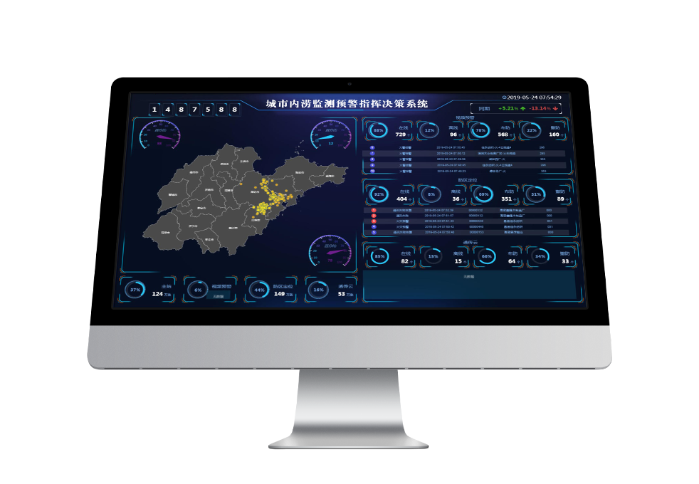 城市内涝监测预警指挥决策系统包含道桥积水监测、窨井水位监测、雨污水泵站监控、城市河道水位监测,监控中心通过监测预警平台软件实时掌握低洼路段积水情况和排水现状。市政管理部门可根据监测结果及时采取防汛排涝措施,达到预警、减灾的目的。