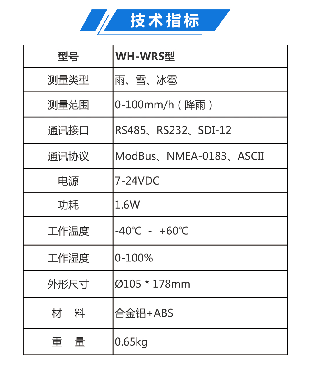 WH-WRS型雷达雨量监测站是一款使用了先进的平板雷达模块,并采用雷达波技术检测雨量的传感器。它可以分辨出雨、雪和冰雹的类型以及降雨的强度。WH-WRS型雷达雨量监测站比传统机械式雨量检测方式更加灵敏和快速的侦测到降雨的起始与结束时间,而且无需担心树叶等物体覆盖在探测器表面影响降雨检测,也无需加热装置防止结冰。WH-WRS型雷达雨量监测站内部无任何移动部件,几乎是免维护,而且体积小,能耗极低。
