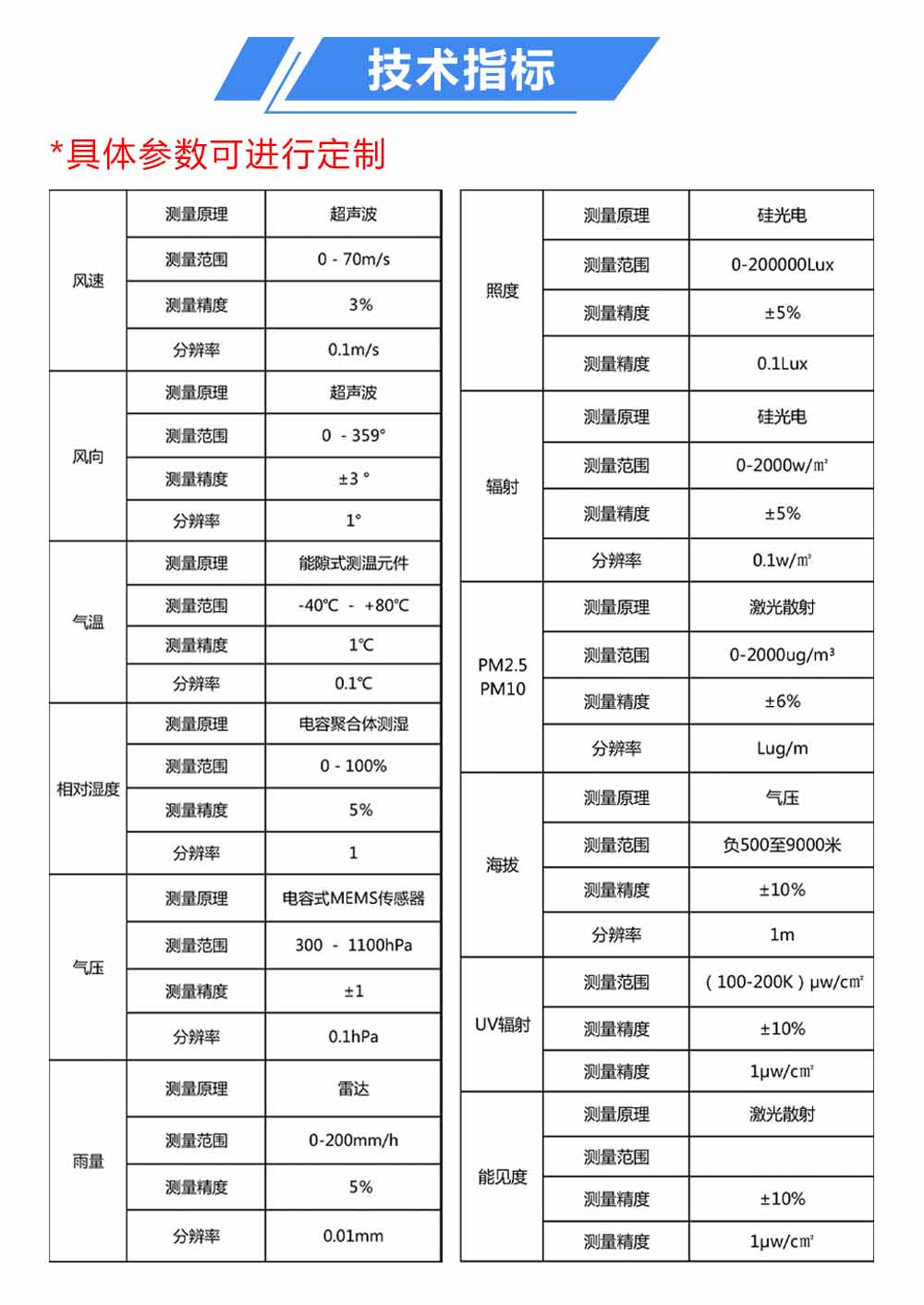 WH-WSA系列气象站是一种能测量多气象参数的一体化微型气象站,能同时测量大气温度、大气湿度、风速、风向、气压、雨量、辐射、照度、UV辐射、能见度、PM2.5和PM10等多种气象要素。设备采用低功耗芯片。由于采用了新技术和新工艺,使结构更加紧凑小巧。还可以选配MINI能见度检测模块,非常适合智慧城市控制系统使用。可根据用户需求,所有检测参数可以任意选配和组合。