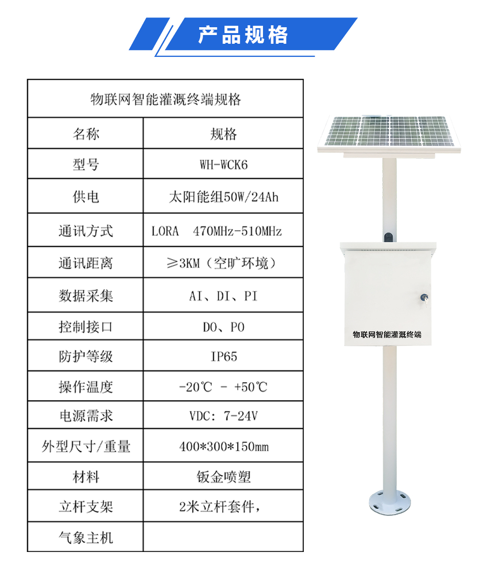 WH-WCK6型物联网智能灌溉终端终端利用物联网、LoRa无线组网、自动化技术,适合大面积灌溉、多点控制阀布局、不方便供电、不方便主控通讯的应用场景。产品通过土壤、气象、作物等类传感器实时采集田间土壤墒情、管网压力、流量等监测数据无线发送到灌溉主控系统汇集的数值进行分析后由‘物联网智能灌溉终端’执行命令动作,以此来实现灌溉自动化控制运行环境。