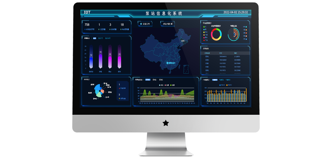 泵站信息化系统适用于城市供水系统增压泵站的远程监控和管理,集中监控水厂各工序运行数据和现场情况,实现水厂水泵、阀门的自动控制。泵站管理人员可远程监控泵站水位或泵站入口压力、增压泵机组工作状态、泵站出口流量、泵站出口压力等远程控制,自动控制增压泵的设置、启动和停止;光纤通信可处理监控站及重要站台全景,实现泵站无人值守运行。